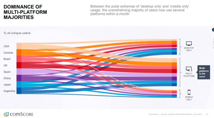 This interesting visual from comScore also part of their digital future in focus shows the picture that marketers need to build up. This panel data shows that the majority of consumers are multiplatform and will often be multi-screening, accessing sites on mobile or desktop, so consistent experiences across device need to be deployed.